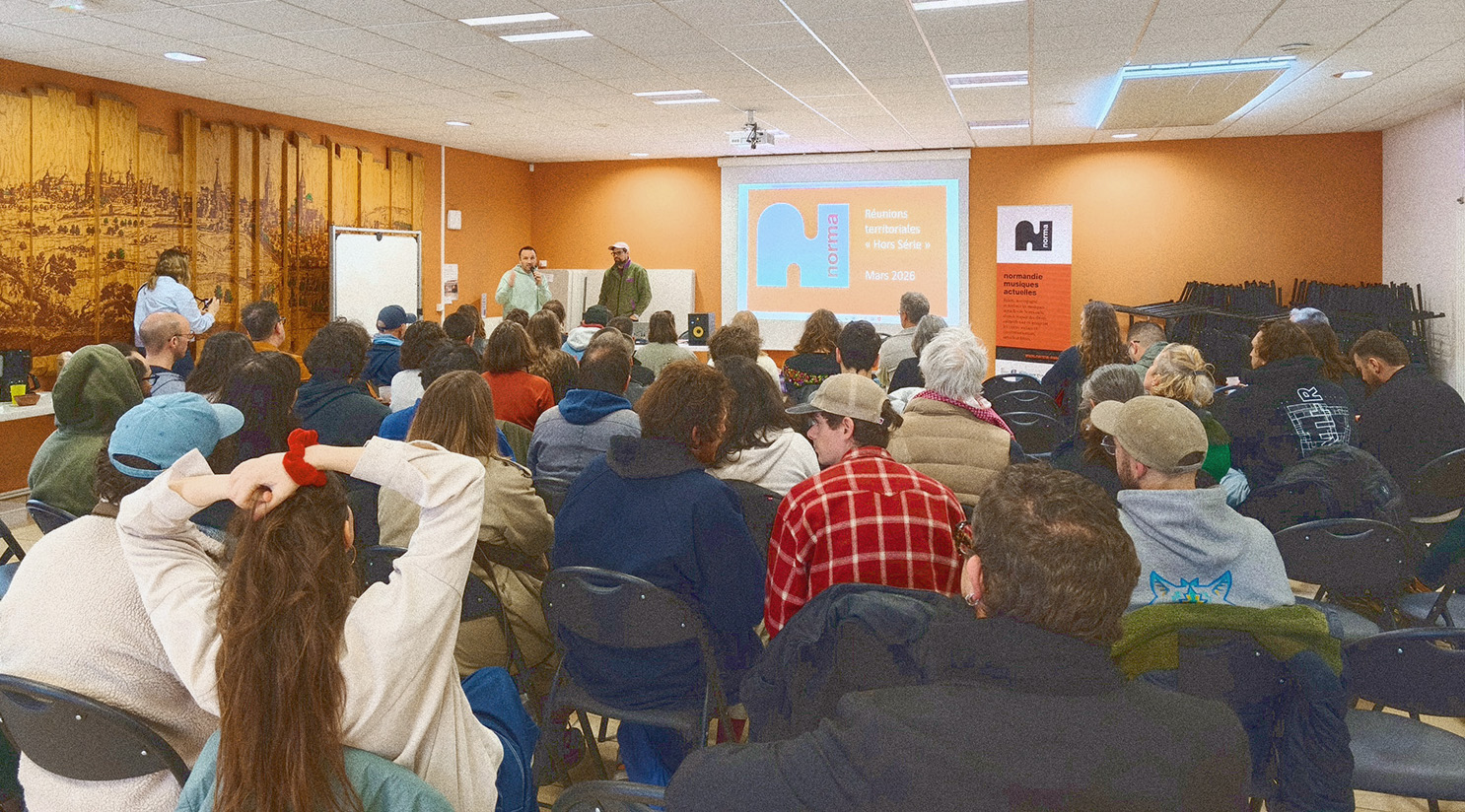 Nous remercions également nos élu·es qui ont pris la parole en ouverture de ces journées : Sandrine Mandeville (directrice du CEM au Havre et co-présidente de NORMA), Matthieu Cattoni (directeur du festival Les Pluies de Juillet et co-président de NORMA), et Isiah Morice (Coordinateur du festival Chauffer dans la noirceur,et secrétaire de NORMA), ainsi que toutes les personnes qui ont participé aux restitutions des travaux.
